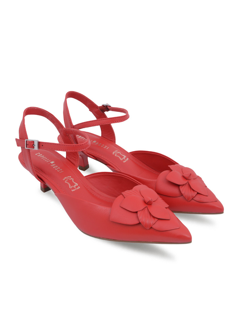 Opis: kožne ženske sandale u crvenoj boji sa kitten potpeticom i cvetnim detaljem