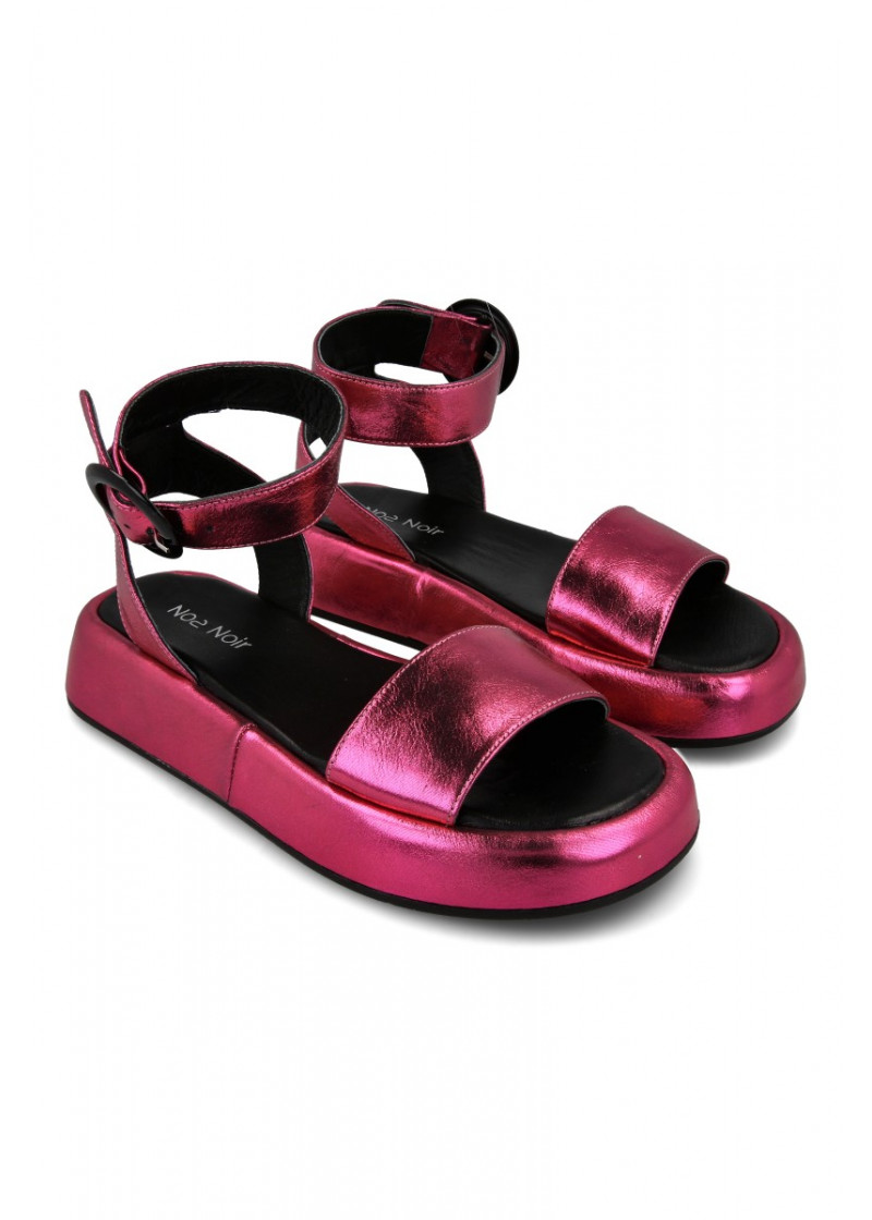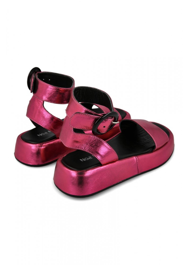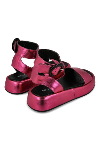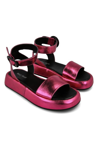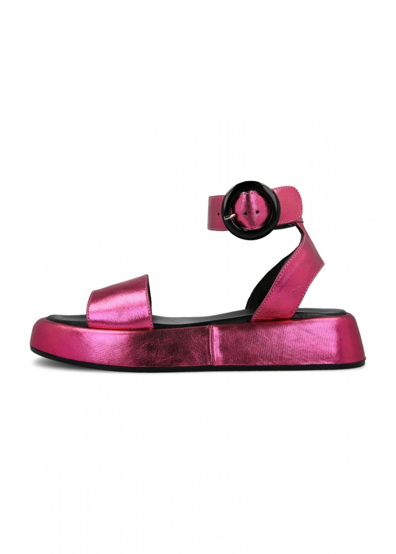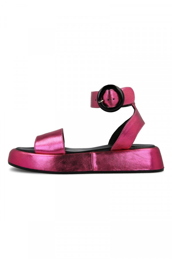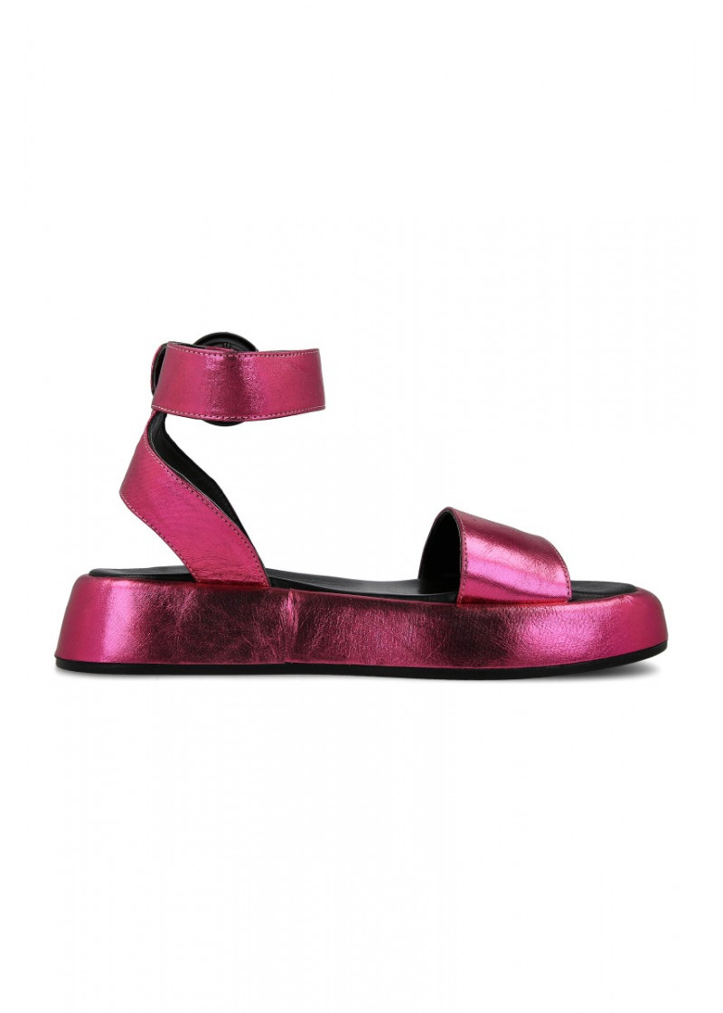 Opis: Kožne ženske ravne sandale u metalik pink boji sa kaišem oko članka