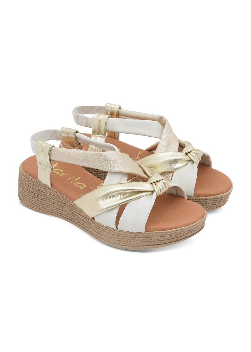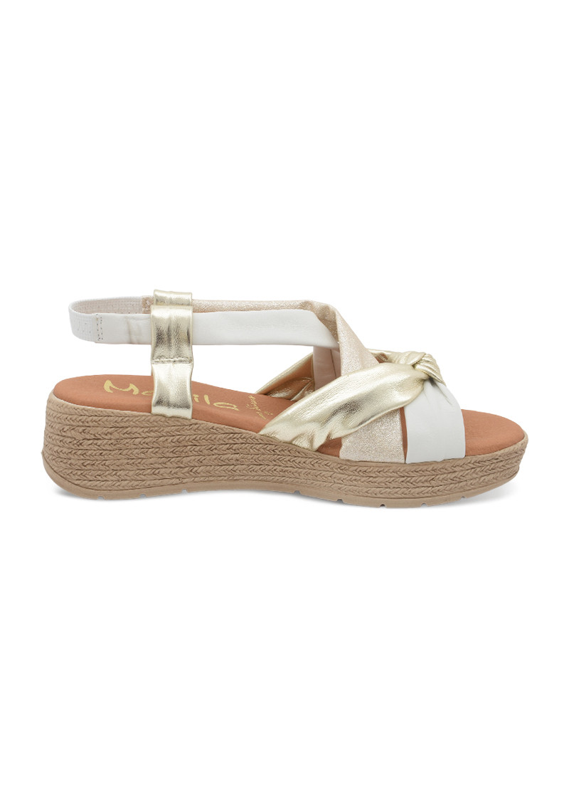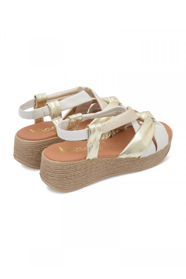 Opis: Kožne ženske sandale sa metalik zlatnim i bež kaiševimai platforma đonom
