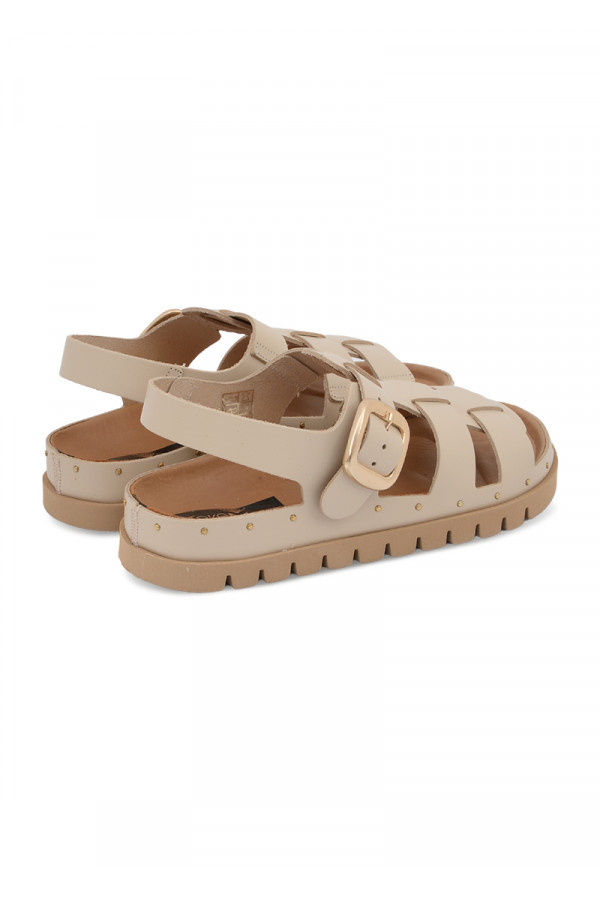 Opis: Kožne ženske ravne sandale u bež boji sa kaiševima, platforma đonom i metalik zlatnim nitnama