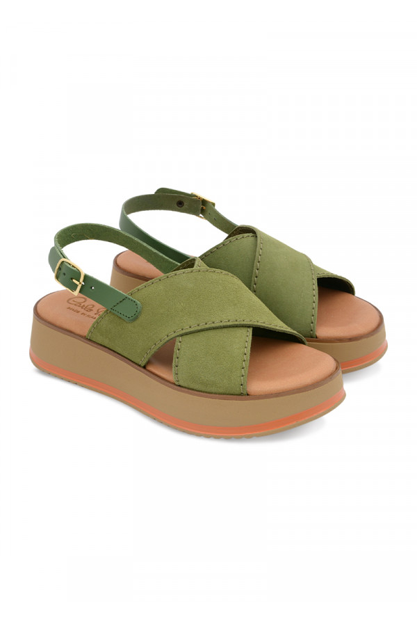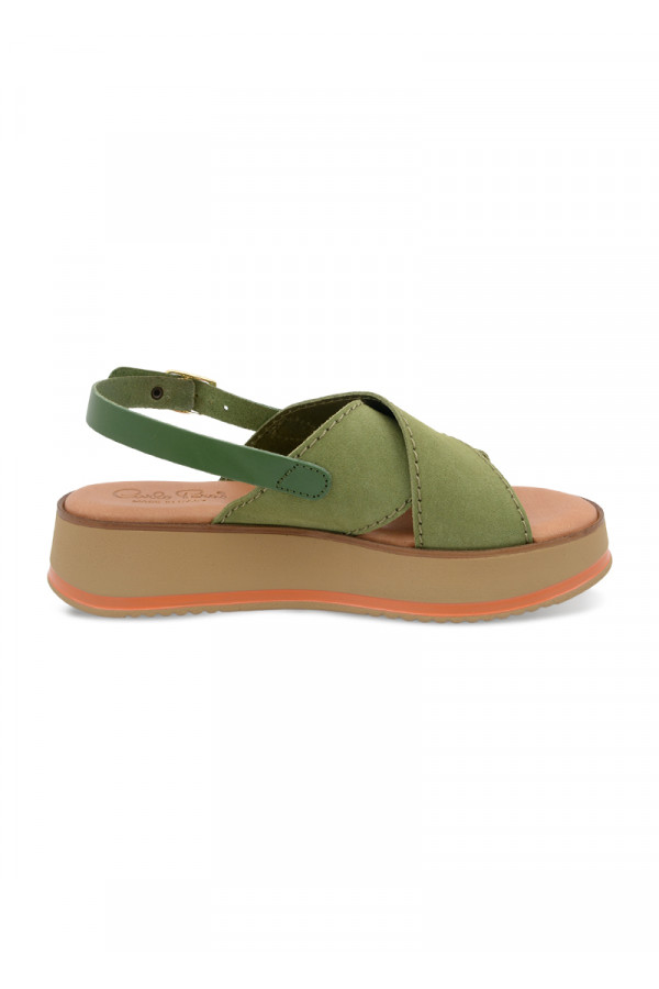 Opis: Ravne ženske sandale od prevrnute kože u maslina zelenoj boji sa podesivim kaišem oko pete i platforma đonom