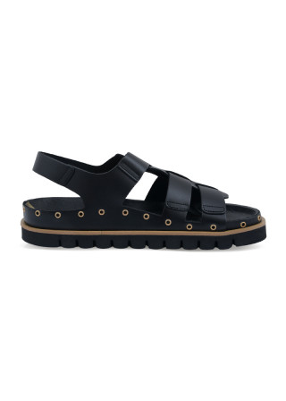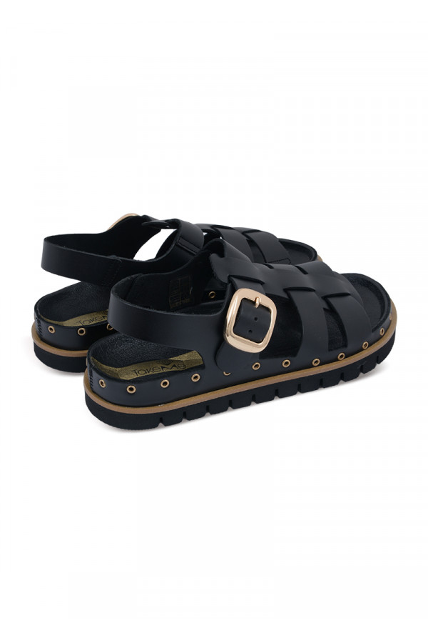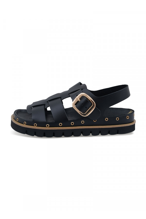 Opis: Kožne ženske ravne sandale u crnoj boji sa kaiševima i metalik zlatnim detaljima