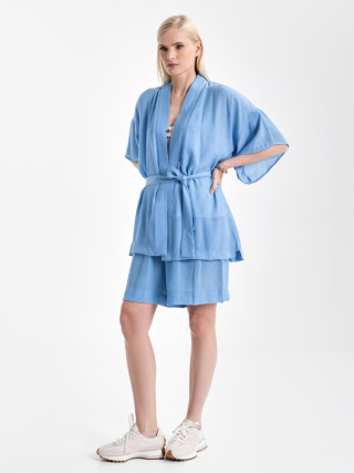Opis: Ženske široke bermude u svetlo plavoj boji sa lastiš pojasom i bočnim džepovima
