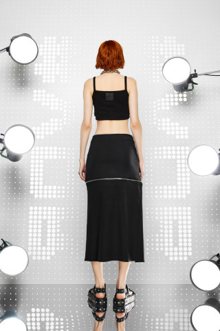 Opis: Asimetrična midi suknja ravnog kroja u crnoj boji sa zipovima