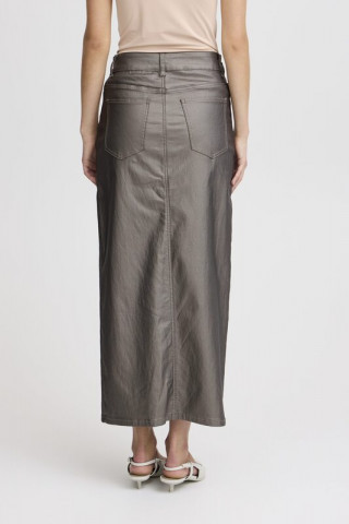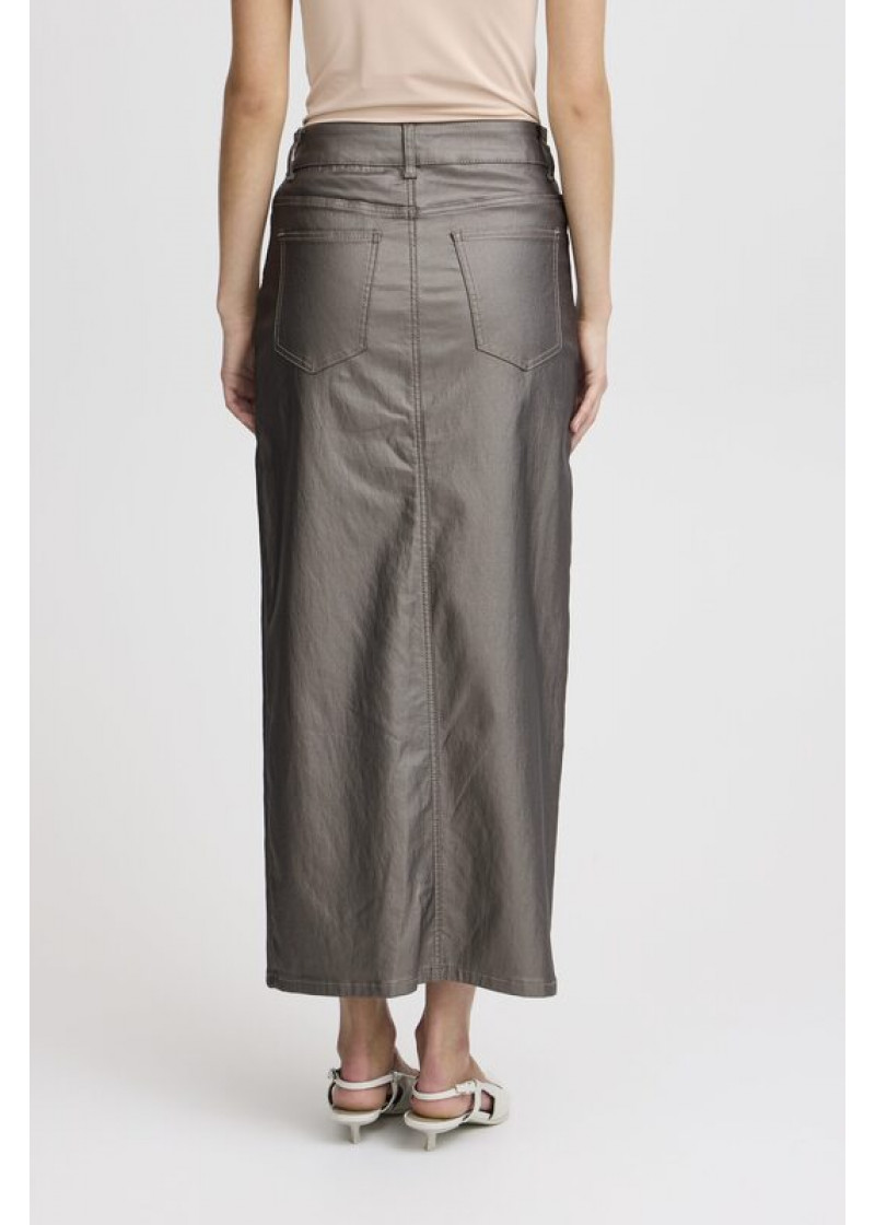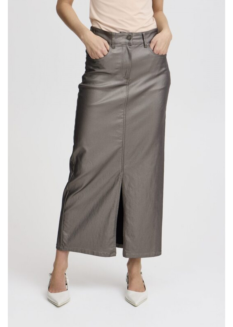 Opis: Duga suknja u metalik sivoj boji sa džepovima i šlicem