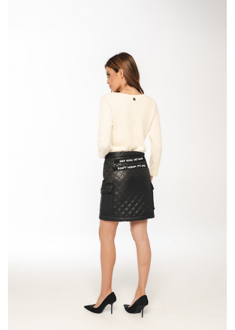 Opis: Kratka suknja od veštačke kože sa štepovima, bočnim zipom i printom