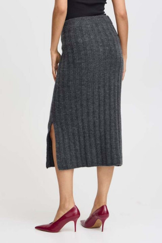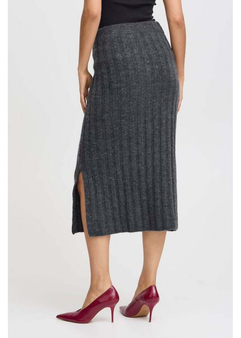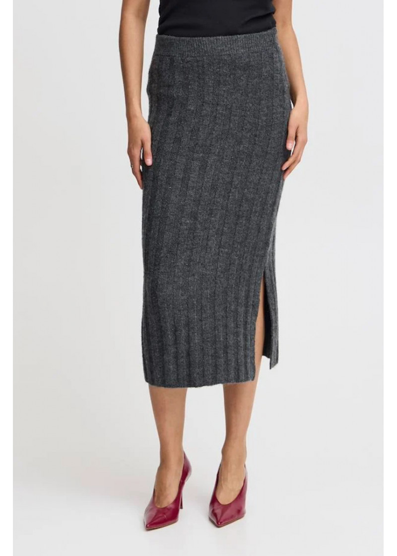 Opis: Pletena midi pencil suknja u sivoj boji sa bočnim šlicem