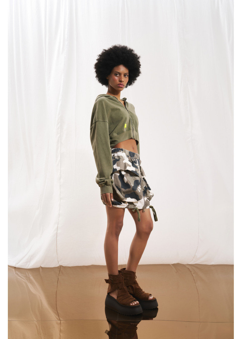 Opis: Pamučna kratka suknja u military printu sa džepovima i lastišem