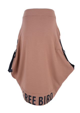 Opis: Midi suknja u braon boji sa zipom, bočnim kaiševima i printom