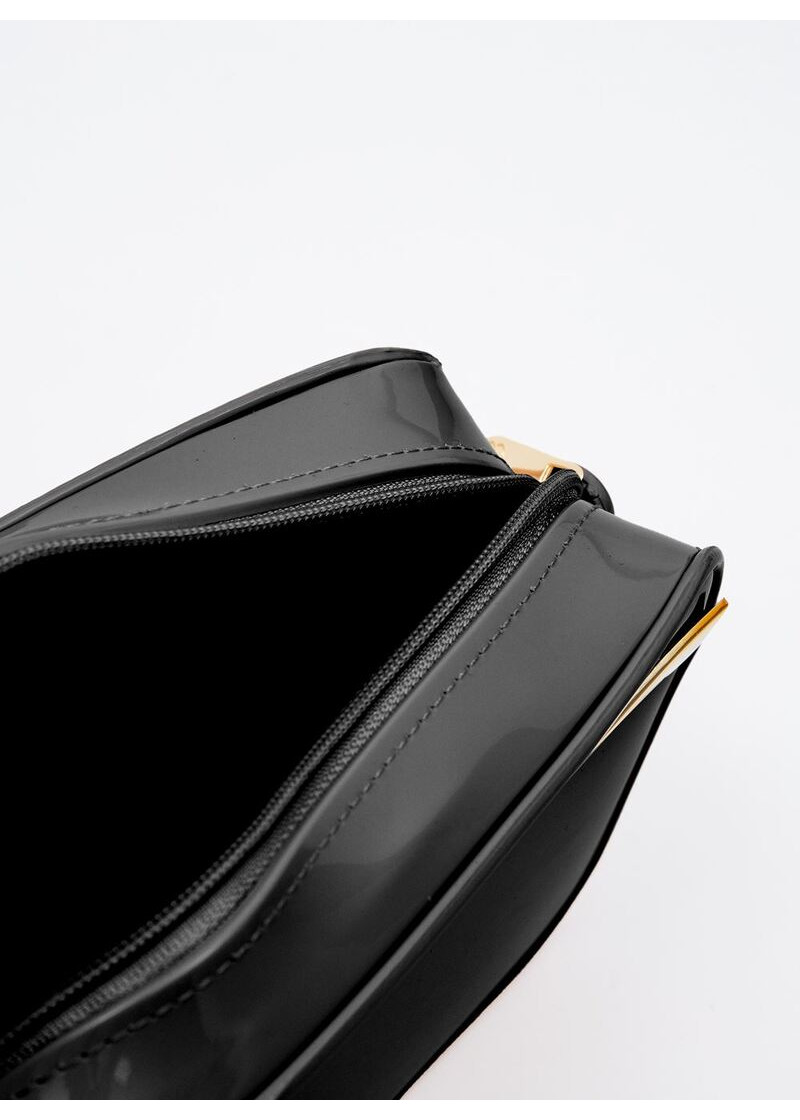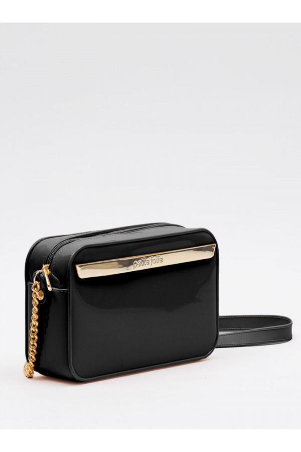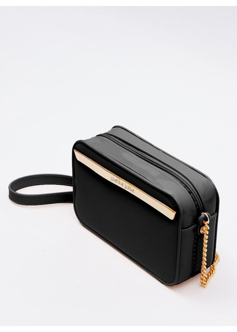 Opis: Gumena ženska torbica u crnoj boji sa metalik zlatnim detaljima