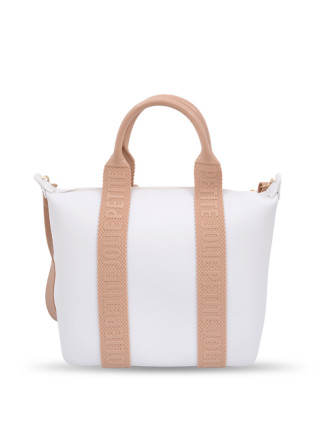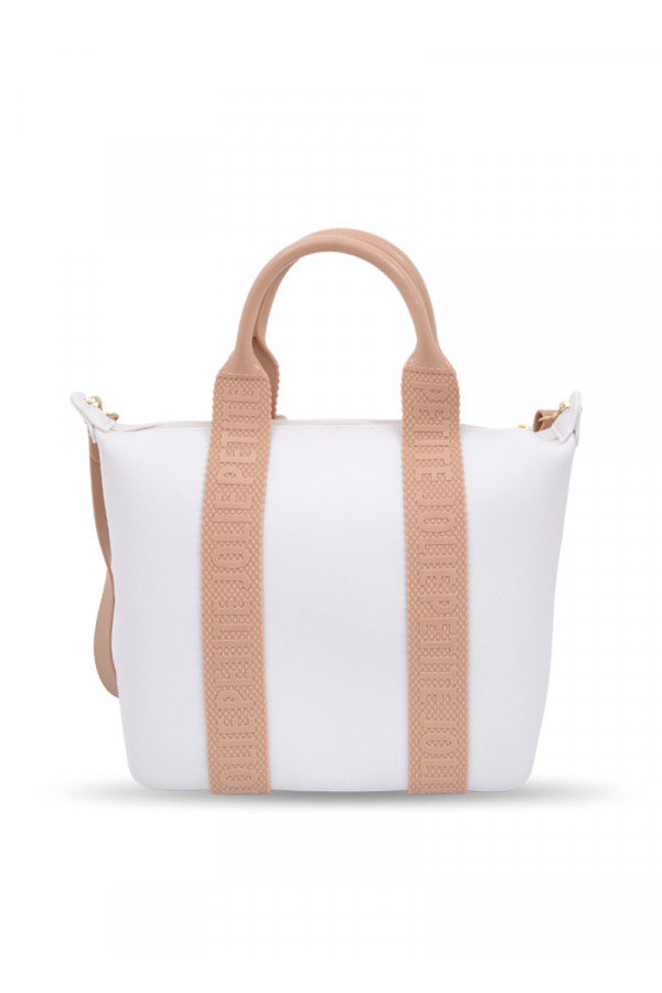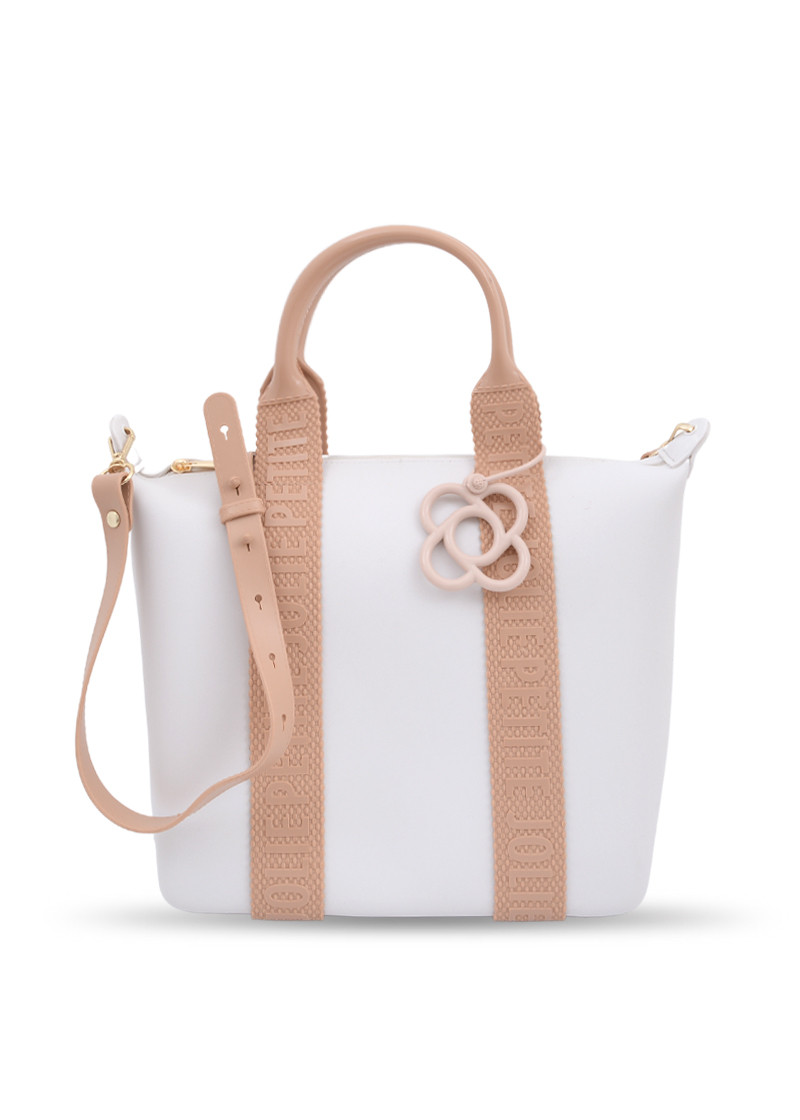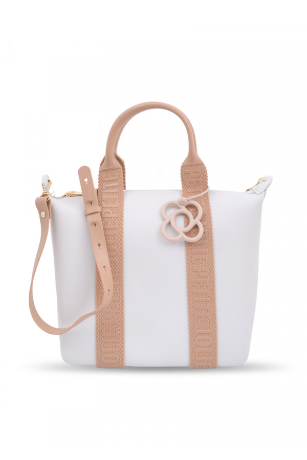 Opis: Gumena torba u beloj boji sa svetlo braon detaljima i logo znakom