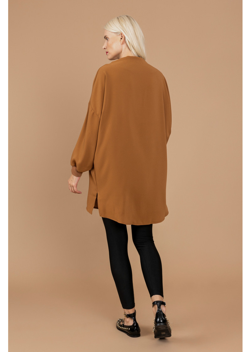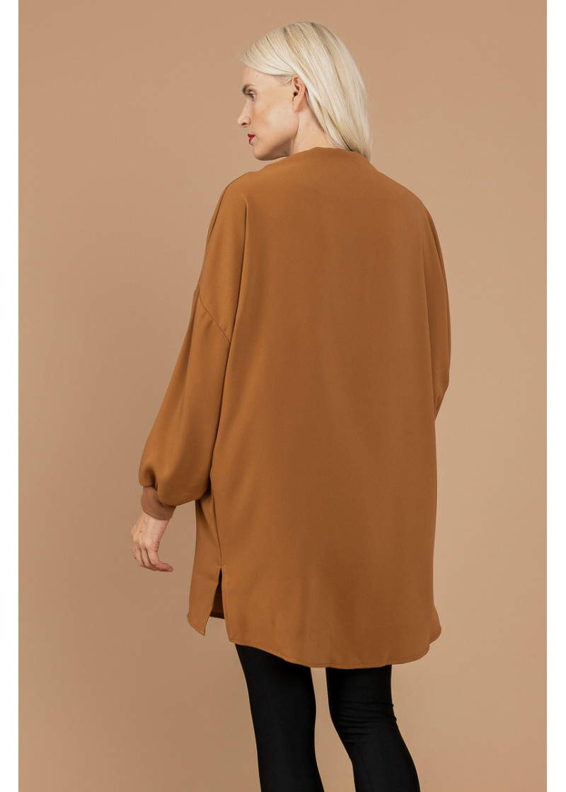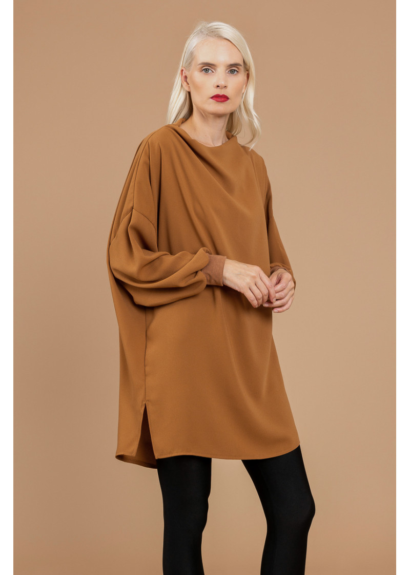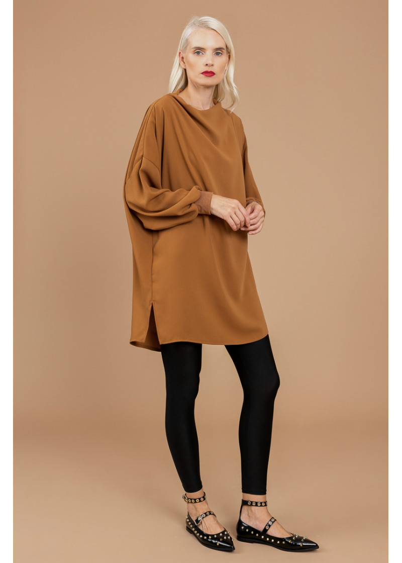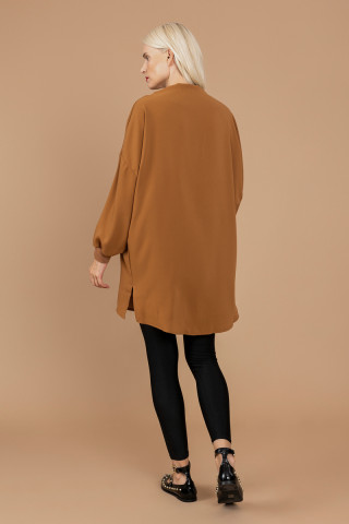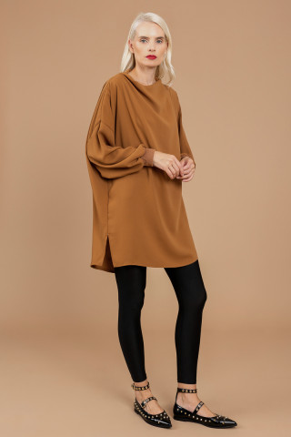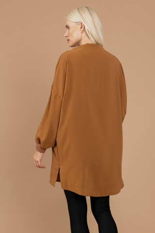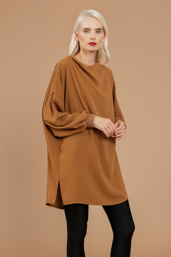Opis: Ženska oversized tunika u braon boji sa dugim rukavima