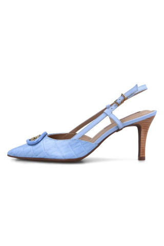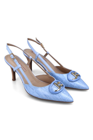 Opis: Kožne ženske sandale u baby plavoj boji sa dekorativnom logo šnalom i potpeticom visine 7,5 cm